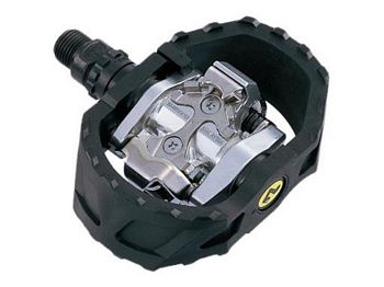 Amazing low priced SPD pedal for all round use including tough Freeride and off-road use. Lightweight and supportive pedal with high impact resin cage for greater foot stability. Features a pop-up binding mechanism for easy entry and release. Pedal can be used with normal shoes as the binding is pushed flat and the resin cage supports the shoe. Cr-Mo spindle with low maintenance sealed bearing cartridge axle. Cleat tension adjustment. Weight:472 grams.