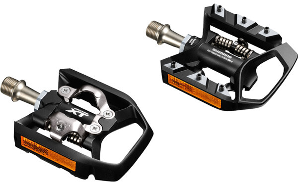 This XT trekking pedal combines SPD mechanism on one side and a stable platform pedal body and pins on the other, you can ride with cleats or normal shoes
